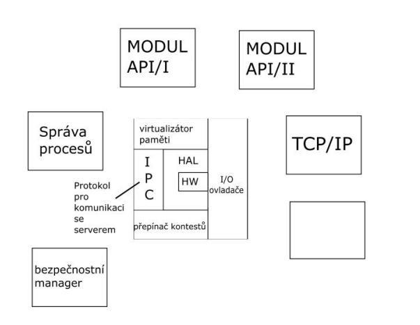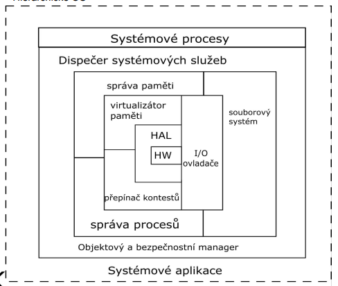 - V Jádře zůstávají pouze zcela nezbytné rutiny pro virtualizaci paměti, přepínání a komunikaci procesů, respektive pro přístup k dalším HW prostředkům