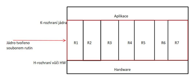- a je omezeno dvěma rozhraními - H (Rozhraní vůči hardwaru) a K (Rozhraní Jádra).